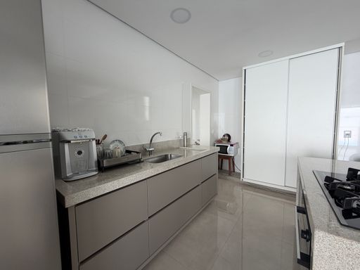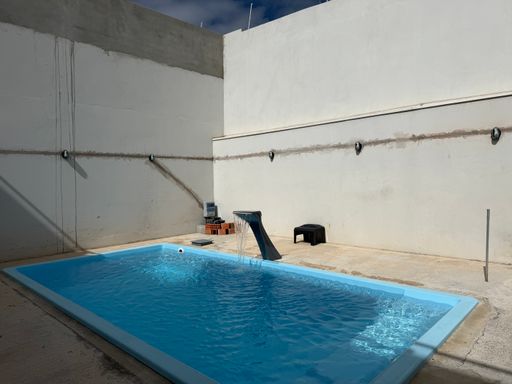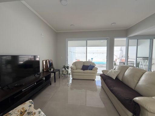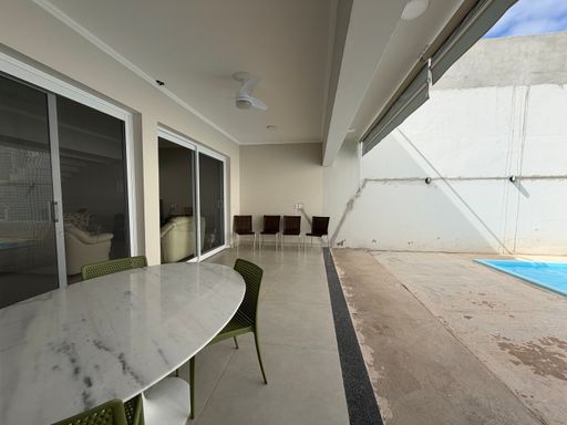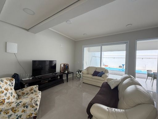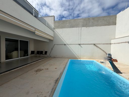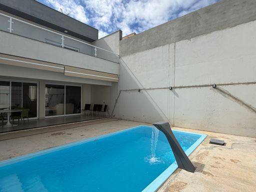 Piso inferior: Sala de estar integrada a cozinha com armários planejados, área de serviço, área coberta nos fundos, quintal, piscina e banheiro externo. O imóvel conta com duas vagas de garagem coberta + espaço descoberto.
