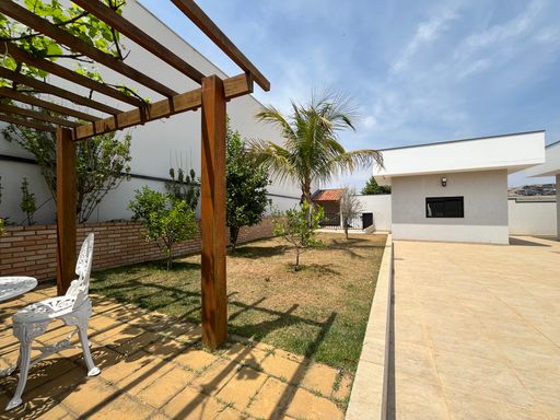 Paisagismo com pergolado e móveis de jardim;