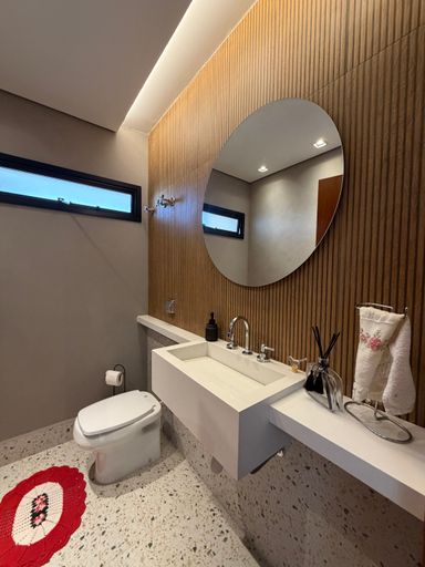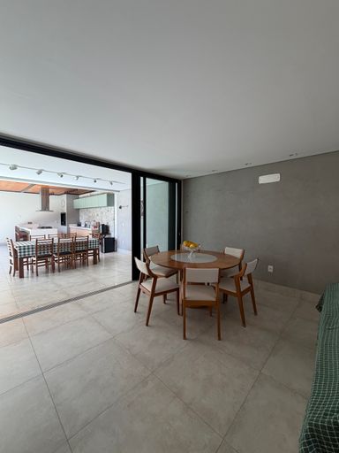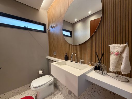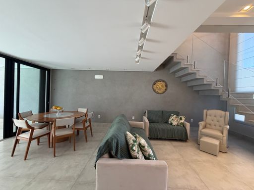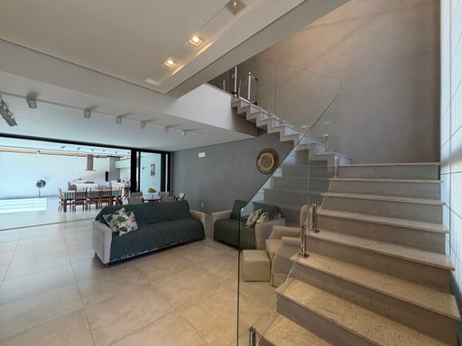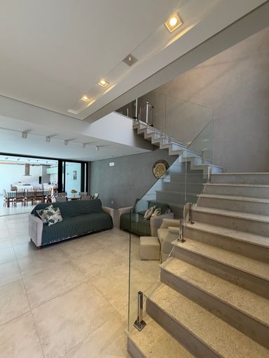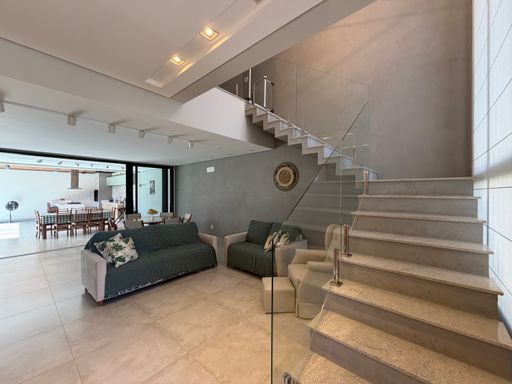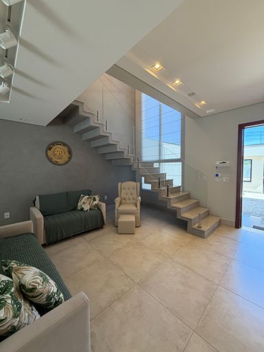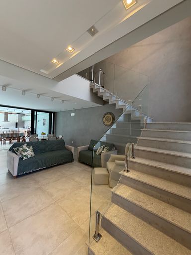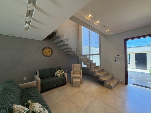 No piso inferior, você encontrará mais um dormitório, que pode ser utilizado como escritório, um lavabo e uma sala ampla, com ótima iluminação natural e já integrada com a cozinha. Além disso, há ainda uma despensa e uma área de serviço, tornando o dia a dia mais prático e funcional.